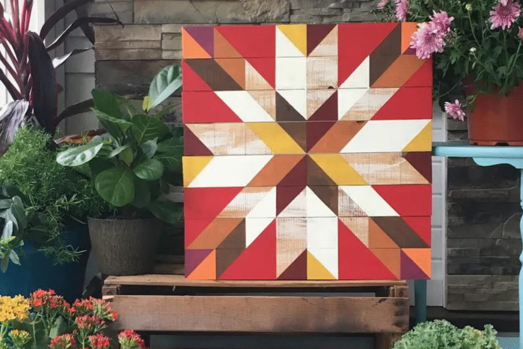 This fall Barn quilt pattern is absolutely gorgeous. Just like in traditional quilting, you can change this up by simply changing your paint colors. This would be gorgeous on a mantel or on an outside porch.