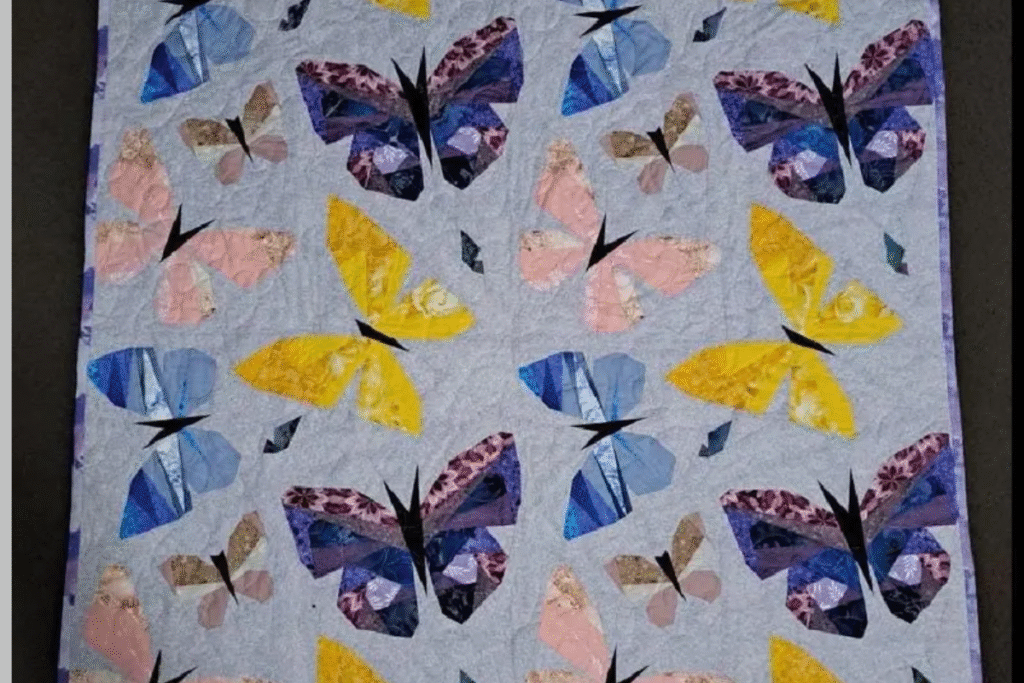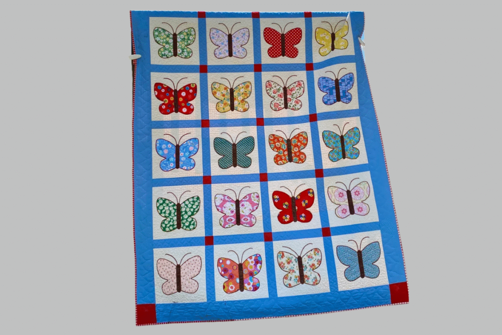 Unlike most quilts that use paper piecing this one uses machine quilting for each butterfly. This is a gorgeous quilt pattern. Some teen in your life will love this finished quilt.