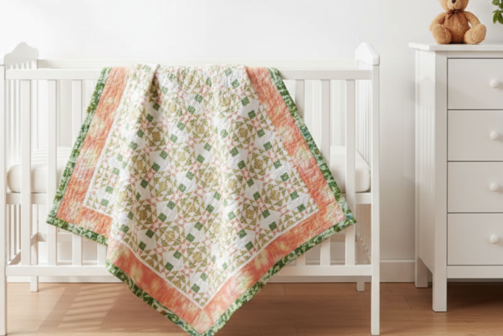 A baby quilt measures 50 x 60″. You will need the following:
