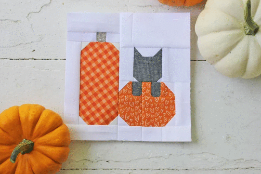 Look at this sweet kitty. Such fun fall quilt block ideas that could be made into coasters, framed or even turned into a table runner or mini quilt.