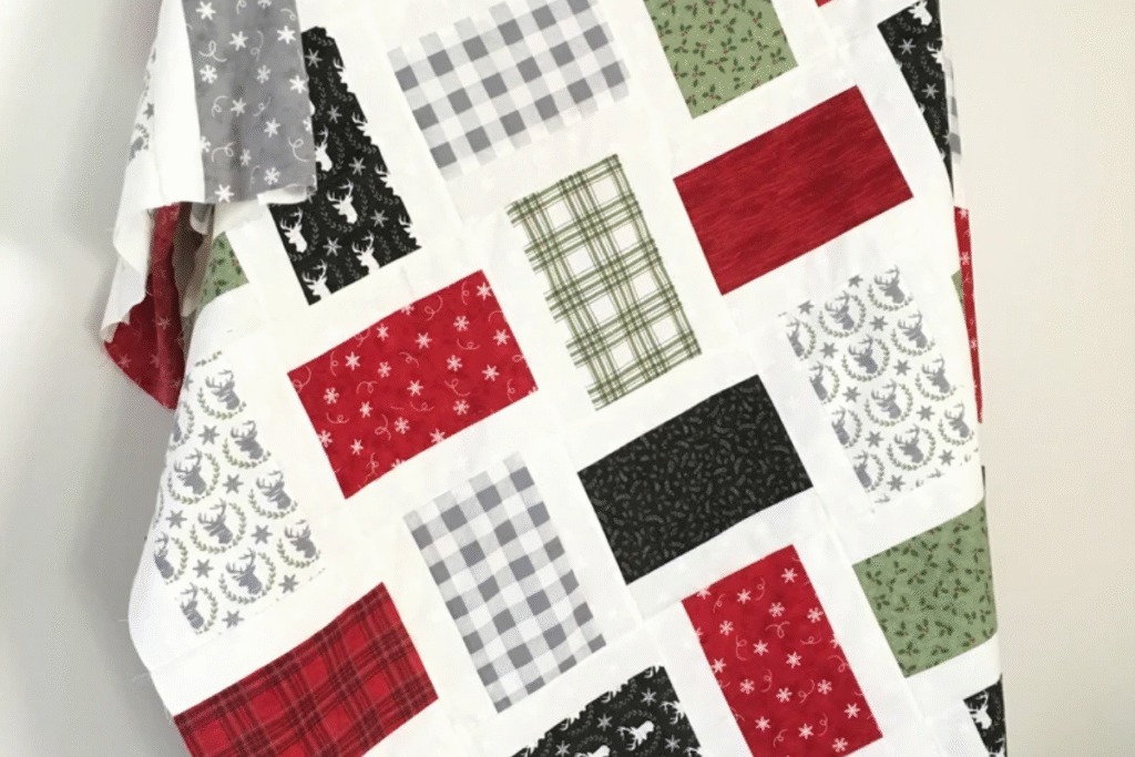 This fat quarter quilt pattern will have you cutting your fat quarters into eight pieces. You can also use a layer cake bundle if you are buying fabric or simple use up those scraps. The fabrics they are showing you shows just how easy it is to make a Christmas quilt.