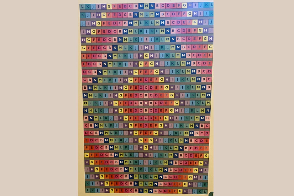 - Lay out all the 2 1/2″ squares in 25 horizontal rows according to the alphabetical designations.