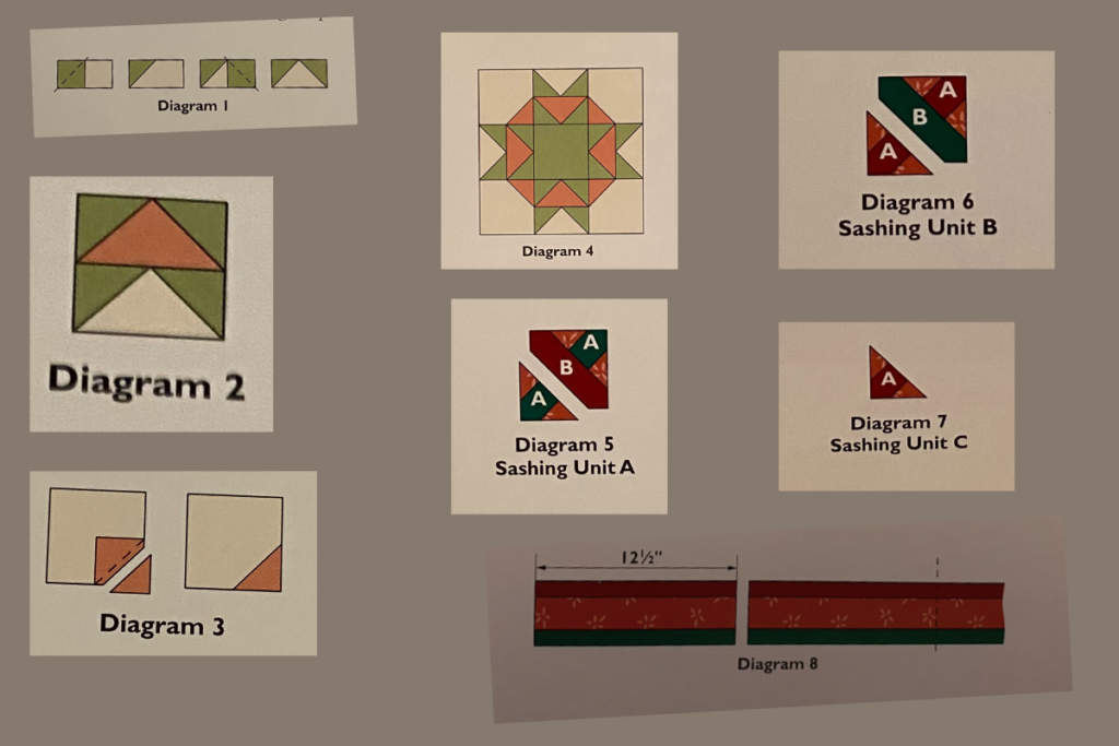 13. Now, join the rows to make a star block. Don’t forget to press the seams allowances in One Direction. Your piece star block should measure 12 and 1/2 in square after it is sewn.