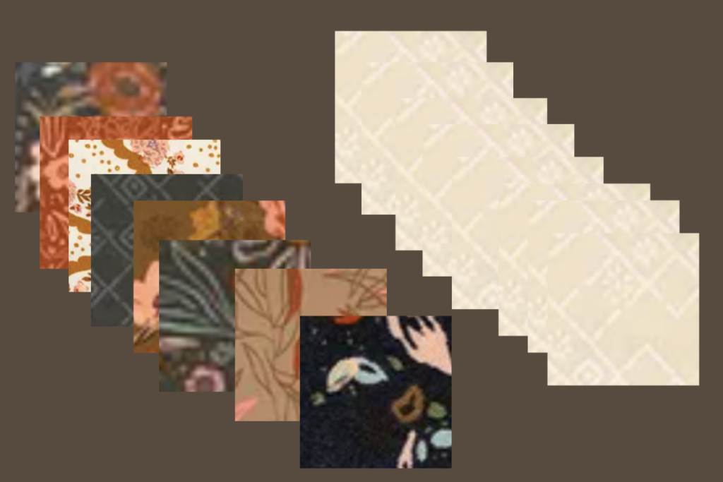 To create this 10-in Quilt Block, you will need eight Cream or white Fabrics that measure 3.5 inches squared. You will also want to find eight fabric varieties that coordinate with your cream or white fabric. I love this Fat Quarter bundle