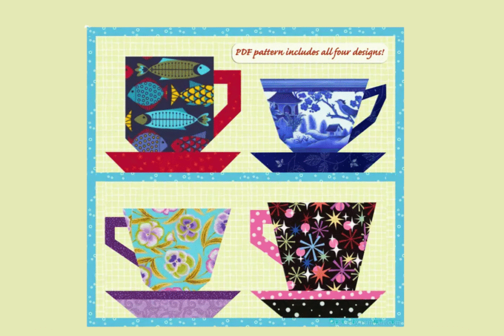 Look at this adorable Tea cups mini quilt. This would be so cute hung up in your dining room or use it as a table topper where you have your tea or coffee every morning.