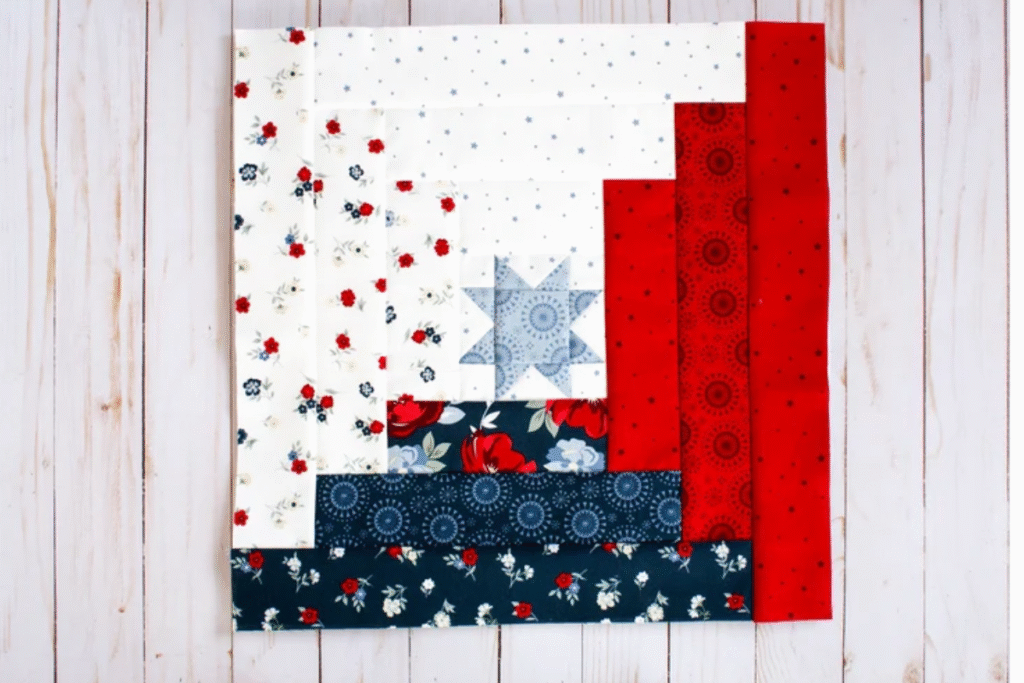 This is another great and easy log cabin quilt block. I love this with the red, white and blues for a patriotic quilt or mini quilt. This would be cute in any combo of colors and if you have leftover fat quarter or jelly roll bundles, this is perfect for this block.