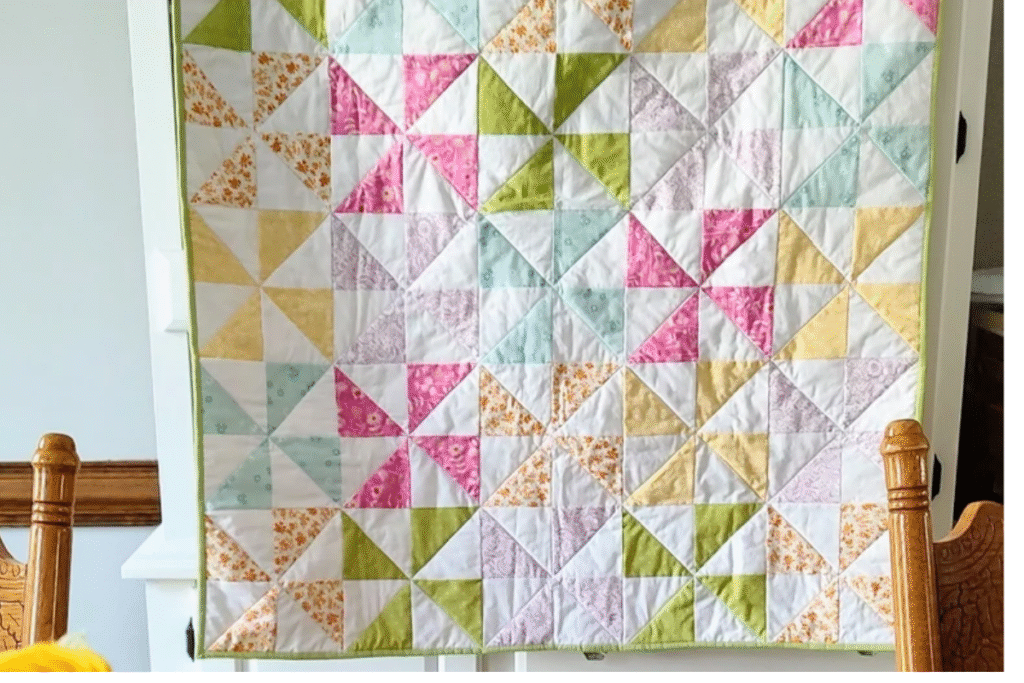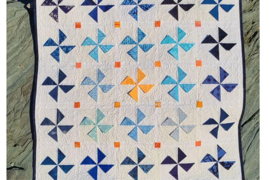 Look at this precious baby pinwheel quilt baby pattern. It’s just simply adorable. As I said earlier, all you have to do is change the colors and you’ll have a completely different looking quilt. This would be a great beginner pinwheel quilt pattern.