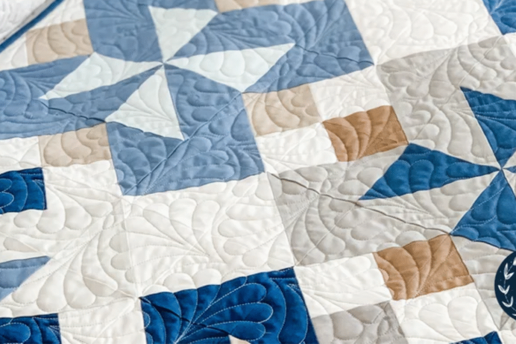 I hope if you’re looking for a boy’s pinwheel quilt baby pattern that this one will inspire you. The blues and the Tans are absolutely gorgeous for a boy’s Nursery but there’s also sizes for throws and for various bed sizes. I love when a designer creates the different sizes so that you can use it again and again.