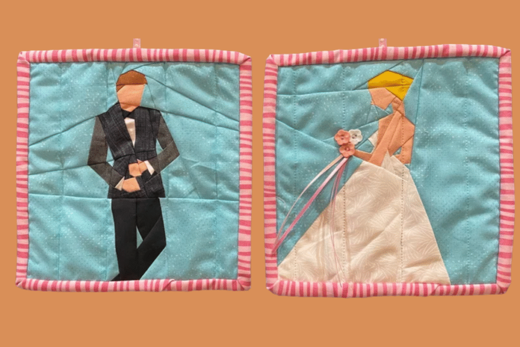 These are so great for bridal showers. They measures 8×8″ before you place binding on them. You can absolutely customize them to fit the bride and groom. These would be super sentimental to the recipient. Just a fun and unique quilted potholder pattern.